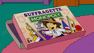 - Suffragette Monopoly is a parody of Monopoly and a reference to suffragette, more specifically to women's suffrage in the United States. The box includes the gold, white, and purple horizontal tricolor flag of the American suffrage movement.